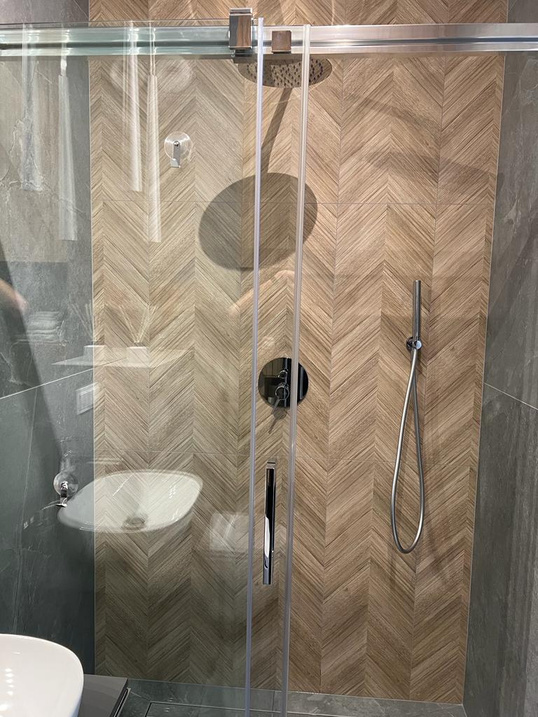 Przestronny prysznic z efektownym szklanym panelem i dodaje przestronności i nowoczesności. Wszystkie elementy wnętrza są starannie dobrane, aby zapewnić wygodę i styl.