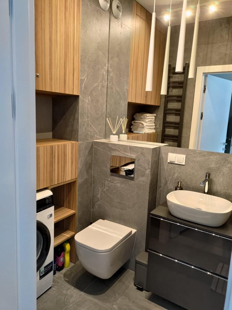 W łazience dominuje minimalistyczny design, gdzie biała ceramika i betonowe oraz drewniane akcenty tworzą harmonijne połączenie.
